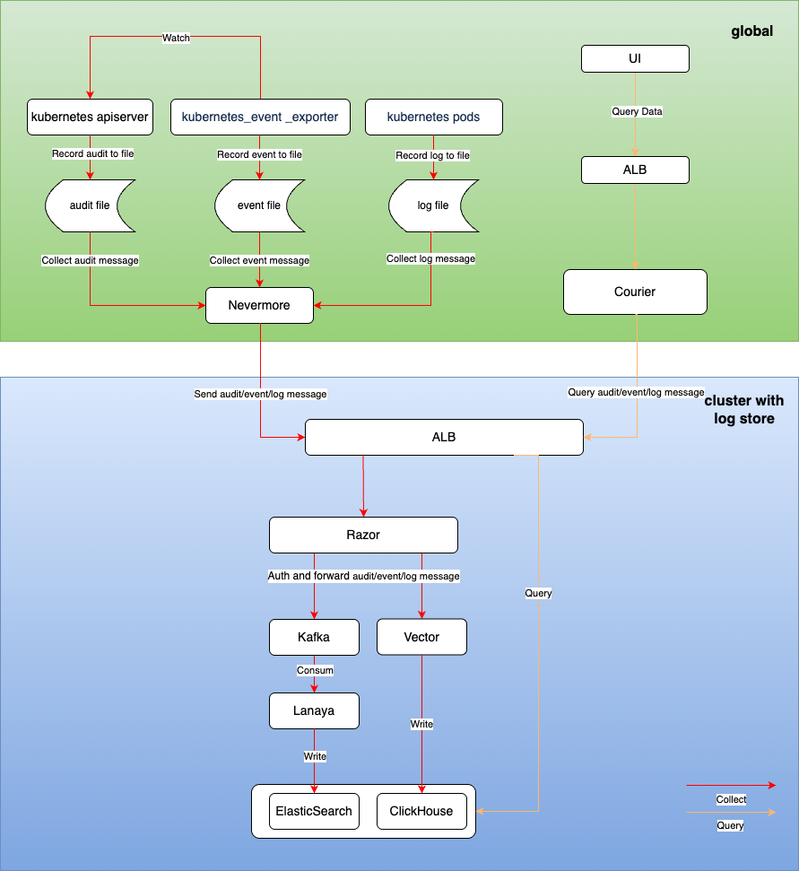 After nevermore collects audit/event/log information, it sends the data to the log storage cluster, undergoing authentication by Razor before being ultimately stored in ElasticSearch or ClickHouse.